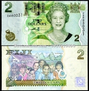 Các em học sinh ở Korobasabasaga và chân dung Nữ hoàng Anh trên tờ tiền 2$ của quần đảo Fiji phát hành năm 2007.